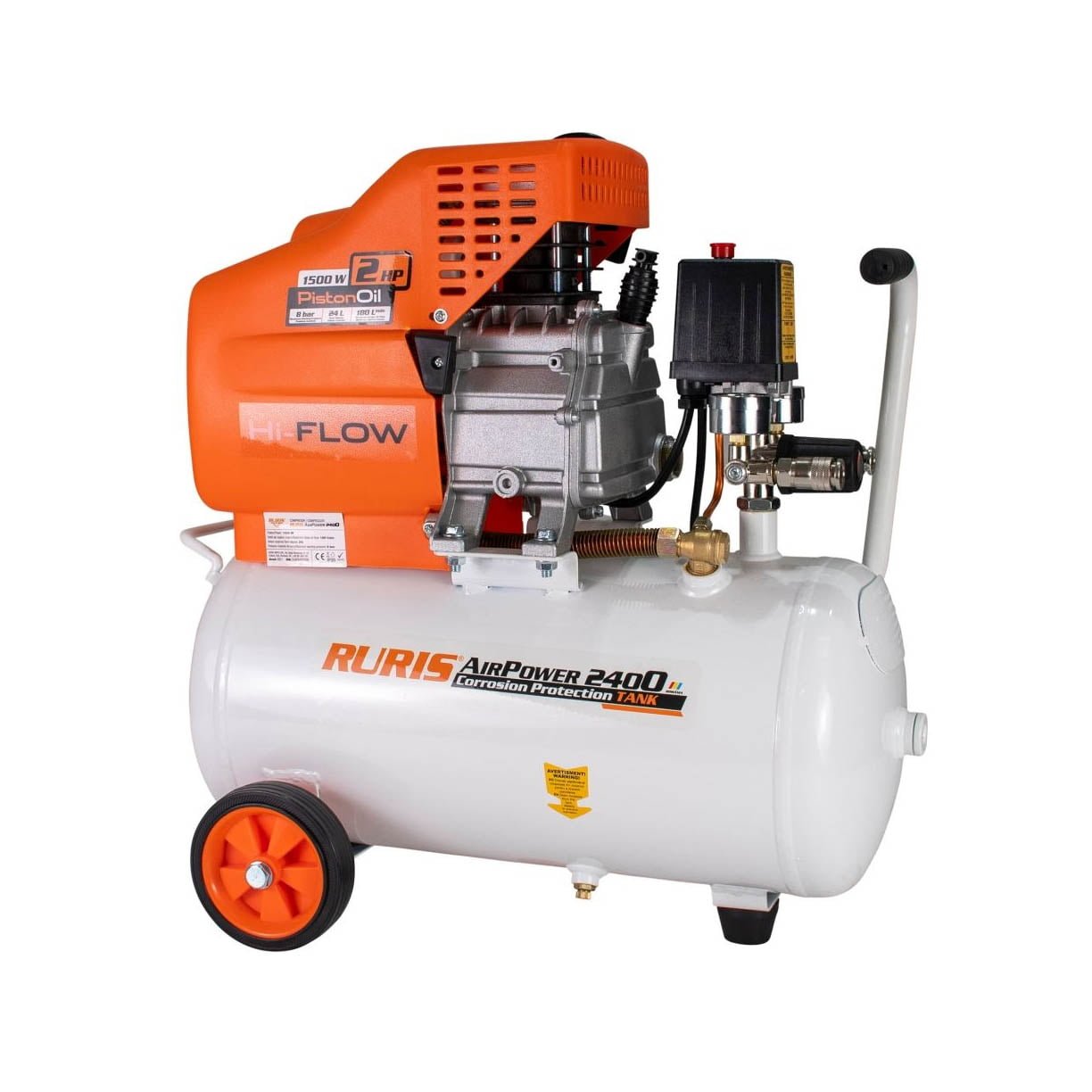 Boca od 24 litre ima veliku količinu vazduha kako bi mogla dovoditi vazduh pod pritiskom od 8 bara. Aspirator blokira buku koju stvara klip kompresora i pruža veću udobnost tokom upotrebe. Za ispravan pritisak kompresor je opremljen manometrom, tako da korisnik može održavati pribor koji oprema kompresor na ispravno kontrolisanom pritisku. Spajanje crijeva visokog pritiska vrši se pomoću brze spojnice kojom je opremljen RURIS kompresor.